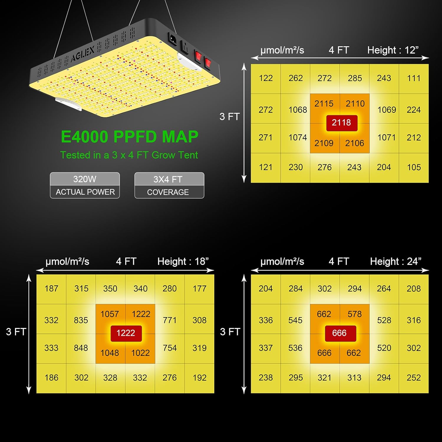 • 【High Yield & Low Power Consumption】Our led grow lights feature 984 high-quality LED beads, boasting an impressive energy efficiency of 2.8 μmol/J. The light's above is made of acrylic glass, which enhances light penetration and overall efficiency. Compared to traditional HPS lights, you can save up to 60% on electricity bills, as our E4000 LED grow light is equivalent to a powerful 1280W HPS light while consuming only 320W!
