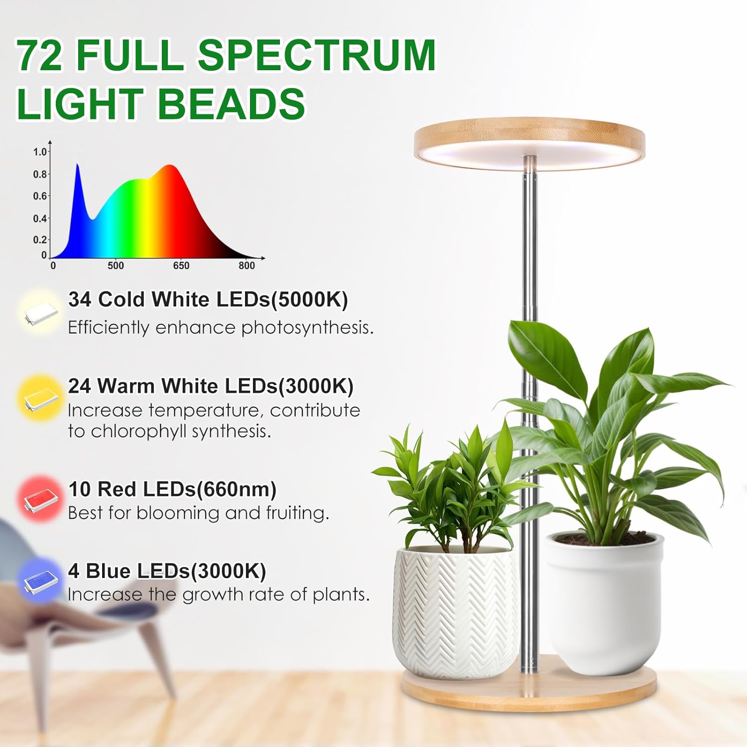 • 72-LED Full Spectrum Grow Light: Featuring 72 high-efficiency LEDs, this light covers the full spectrum from 380nm to 780nm, mimicking natural sunlight. It promotes seed germination, photosynthesis, and flowering with improved PAR/LUMEN output, ensuring ideal lighting for plant growth