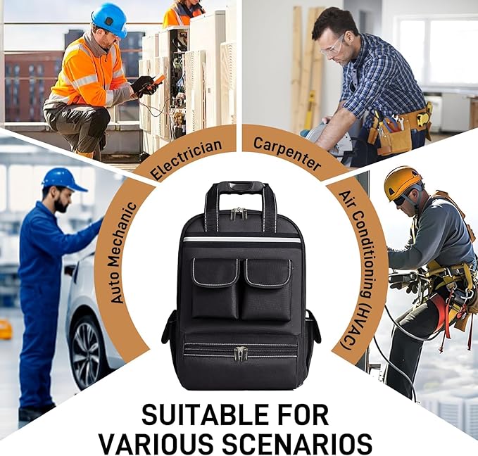 • 【Shoulder-Strips Design】-The tool bag backpack itself is low-light, the wide and thick shoulder strips design can reduce your shoulder strain during extended use. The adjustable shoulder straps ensure a comfortable fit for users of all heights (160cm-200cm / 5'3"-6'7"). And the reflective stripes on the shoulder strips can protect you in the low light