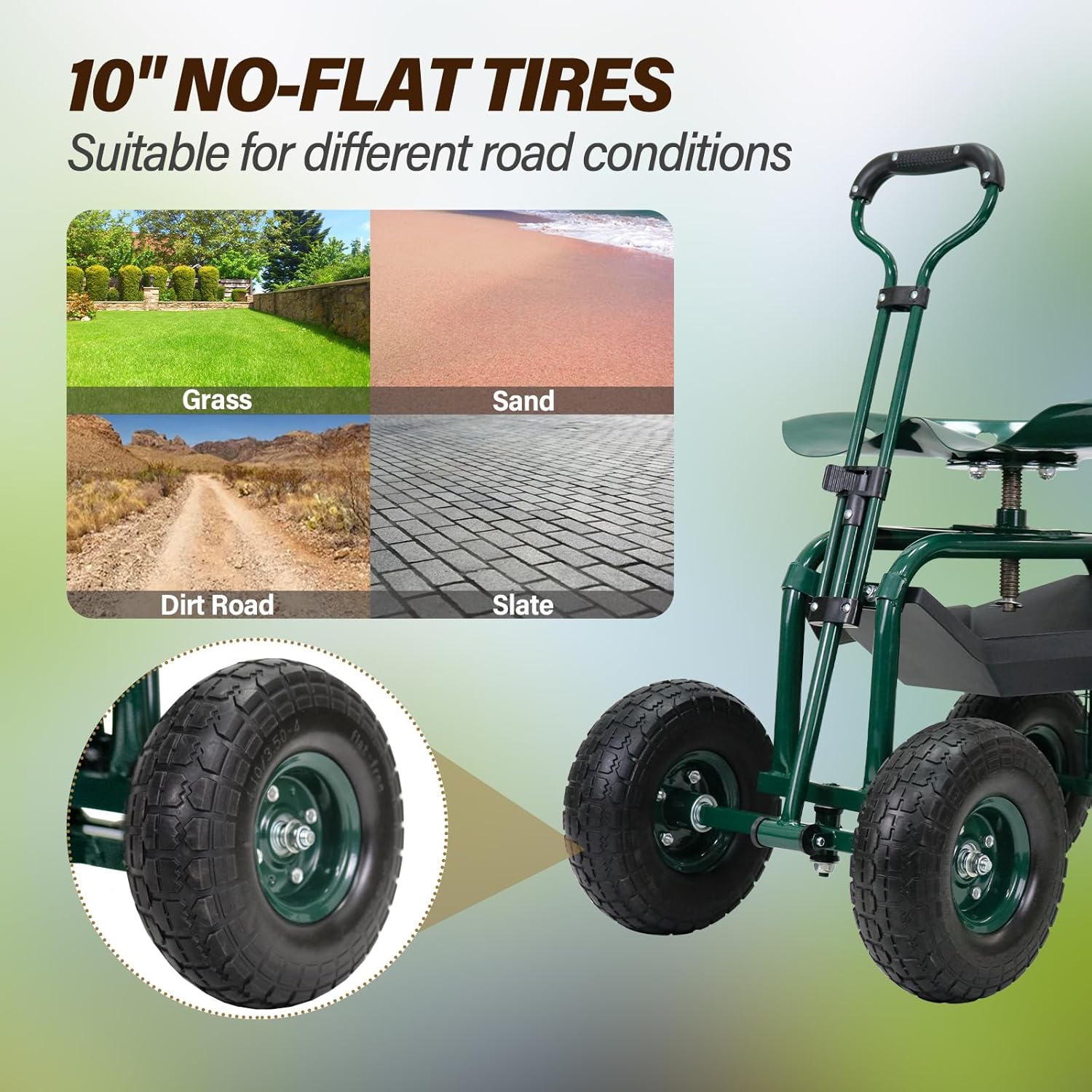 BESTHLS Garden Cart with Seat on Wheels Rolling Gardening Stool with Wheels Heavy Duty for Planting with 360 Degree Swivel Seat Steering Handle & Utility Tool Tray