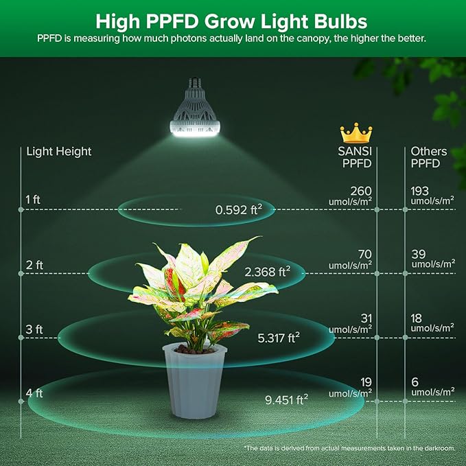 • HIGH BRIGHTNESS & ENERGY SAVING: PPF: 42umol/s, PPFD: 260μmol/s/㎡ @1ft ! Effectively help your plants or flowers grow faster and stronger! This SANSI 30W dimmable grow light bulb is equivalent to 450W traditional light bulb, providing 3000lm high brightness, save up to 93% electricity