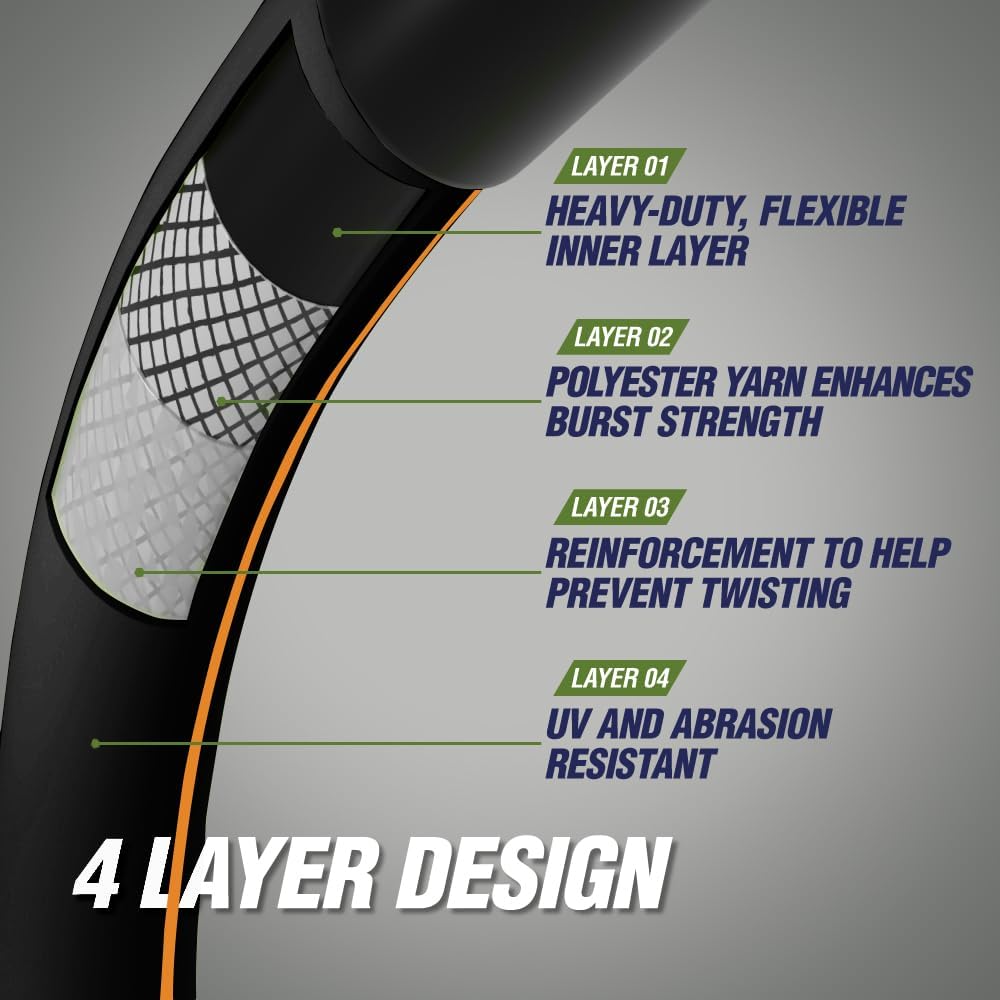 • HEAVY DUTY 4 LAYER DESIGN: ultra strong, heavy duty hose to tackle any outdoor job; abrasion and crush resistant for maximum durability; UV and rust resistant with high quality anodized aluminum couplings for use in all weather