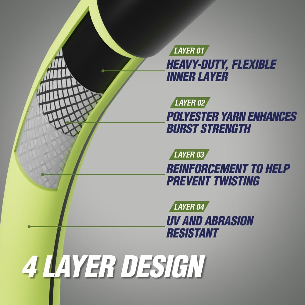 • HEAVY DUTY 4 LAYER DESIGN: ultra strong, heavy duty hose to tackle any outdoor job; abrasion and crush resistant for maximum durability; UV and rust resistant with high quality anodized aluminum couplings for use in all weather
