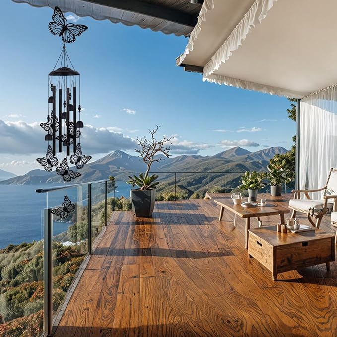 - Unique design: The length of the butterfly wind chimes is about 34 to 36 inches. Each wind chime is decorated with 7 little butterflies. There are 4 hollow aluminum tubes under the wooden support. When colliding, each aluminum tube has its own unique tone, and there are 6 bells around the aluminum tube. Make the sound of wind chimes more pleasing. It can emit beautiful and harmonious sounds, and bring clear and sweet ringtones anywhere.