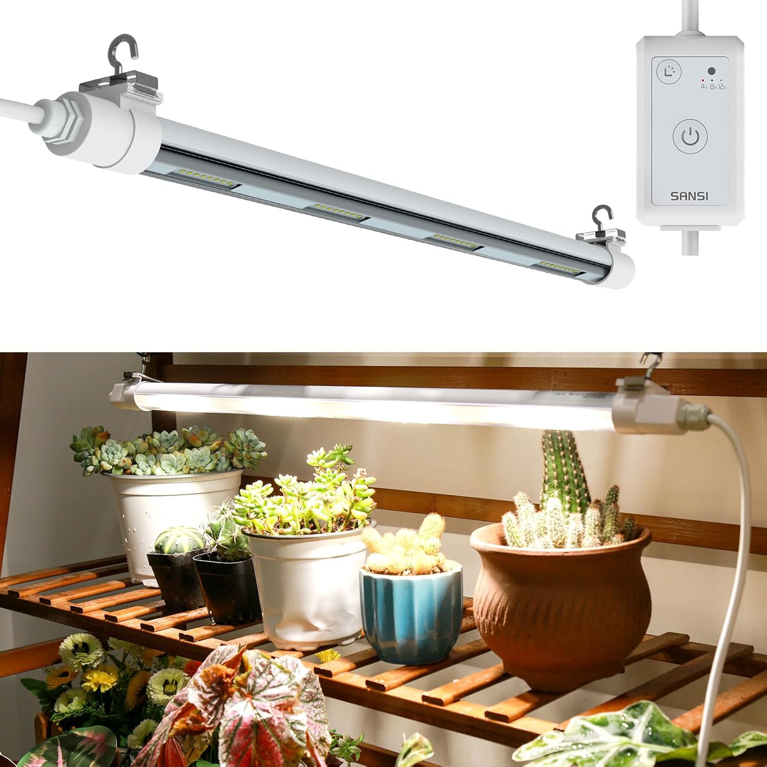SANSI T8 Grow Lights for Indoor Plants, 2FT 4000K Full Spectrum, 25W (195W Equivalent) LED Grow Light Strips with 4-Level Dimmable, Auto On Off 4 8 12 Hrs Timer, IP54 Waterproof for Seed Starting