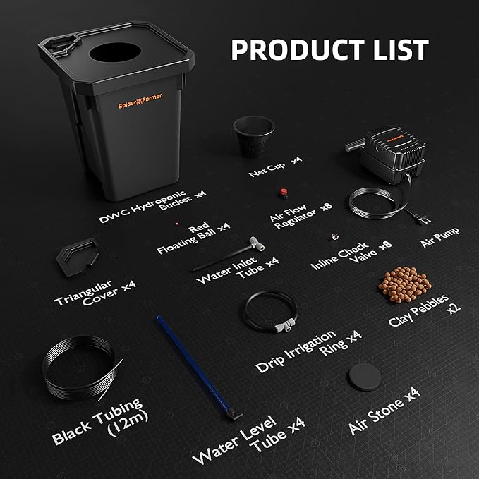 • 𝐃𝐖𝐂 𝐇𝐲𝐝𝐫𝐨𝐩𝐨𝐧𝐢𝐜𝐬 𝐒𝐲𝐬𝐭𝐞𝐦 𝐊𝐢𝐭 𝐈𝐧𝐜𝐥𝐮𝐝𝐞𝐬: 4pcs 7-gallon DWC Buckets, 4pcs triangular cover, 4pcs net cup, air pump, 4pcs air stone, 12M 4/6mm black tubing, dry clay pebbles, 4pcs water level tube, 4pcs drip irrigation ring, user manual and other accessories