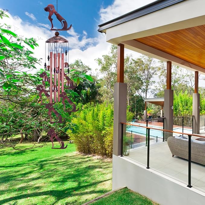 • UNIQUE DESIGN: Dogs wind chimes, pure hand-made with 4 red copper durable aluminum tubes. 1 round metal caps. 7 cute dogs, 6 bells, 18 small lucky beads, 1 hook up. From the hanging ring to the bottom hanger, whole wind chimes measures 36 inches. Each metal tube has its own unique tone when it collides. Enjoy the wonderful music to soothe your body and mind. Enjoy peaceful melodies it plays. The sound is soft, clear and relaxing.