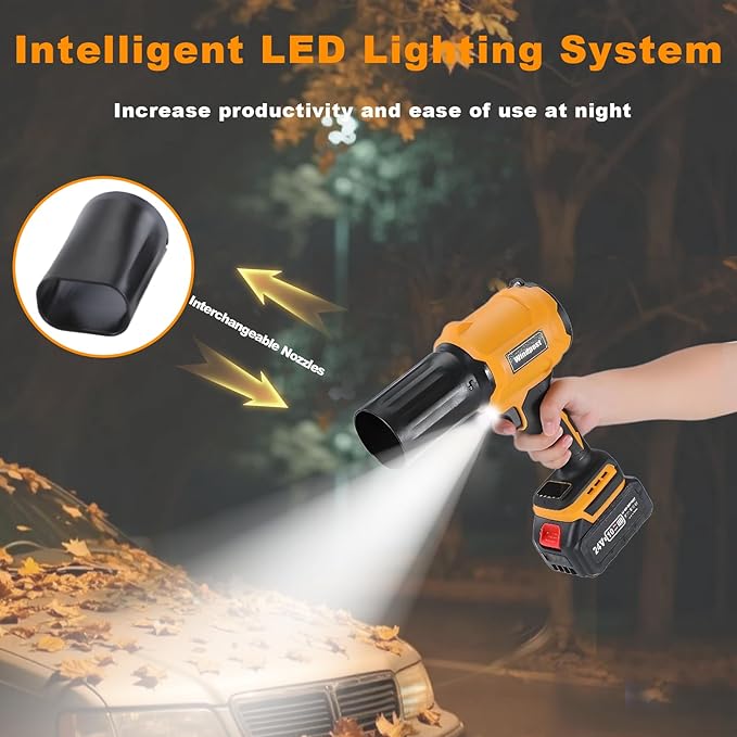 • 【All-in-One Convenience】This powerful battery leaf blower includes 2 versatile nozzles and a built-in LED light for enhanced visibility, making it ideal for a wide range of tasks such as cleaning your yard, clearing leaves, dusting hard-to-reach areas