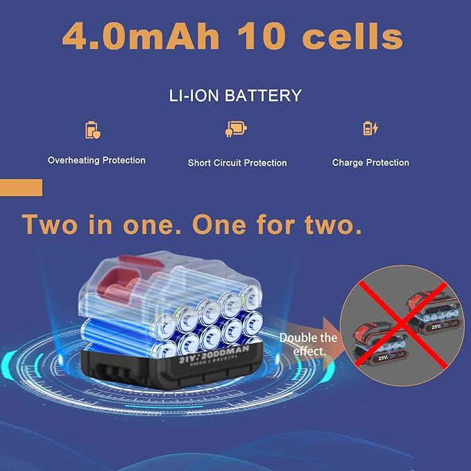 • 【Battery Care & Installation Instructions】Initial Use: Fully charge the battery before first use. Long-Term Storage: If the tool won’t be used for an extended period, recharge the battery to 40–60% every 2–4 weeks to maintain battery health and prevent deep discharge. Secure Installation: When attaching the battery, press the red locking button until you hear a firm "click"—this ensures a tight fit and prevents accidental loosening during operation.