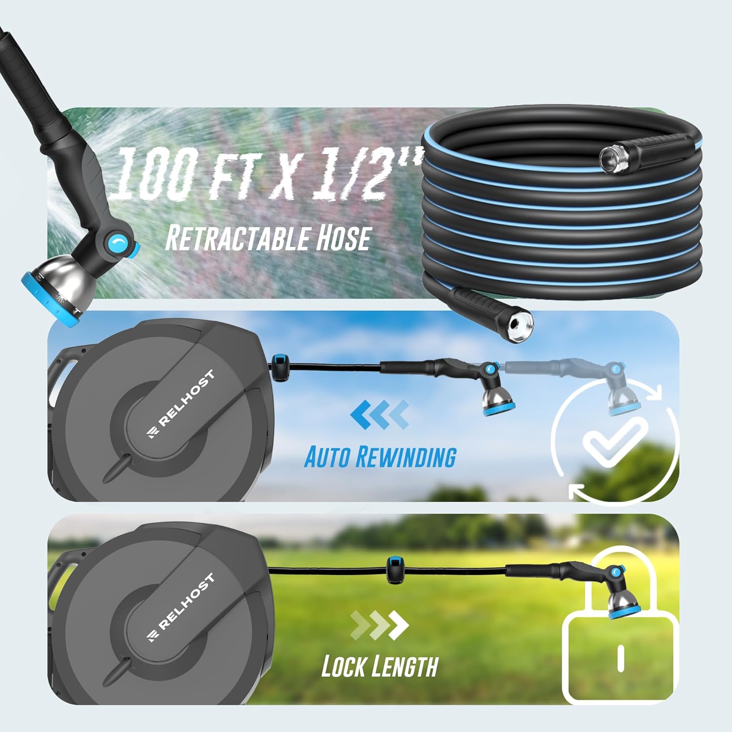 • Over 20,000 Retraction Rests - Validate the exceptional durability and reliability of the Relhost retractable hose reel. Its outer casing uses UV and freeze-resistant materials, extending lifespan and sustaining good appearance and performance annually