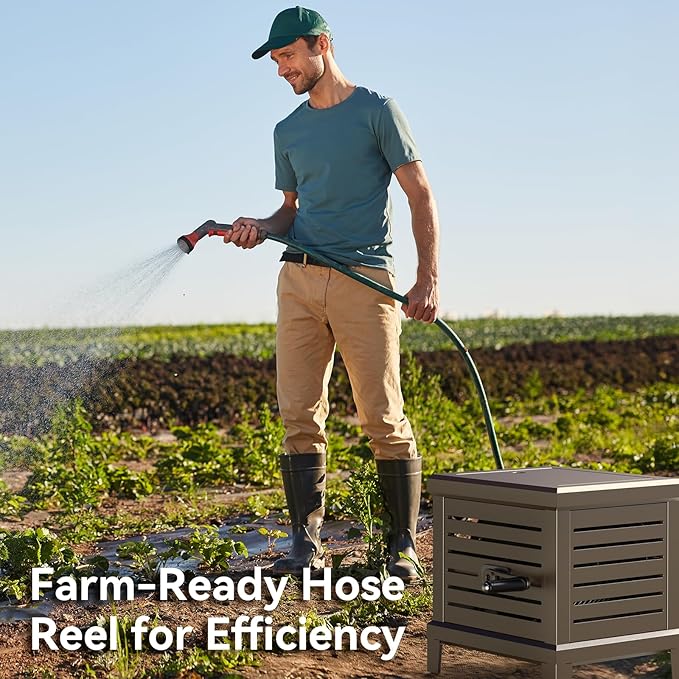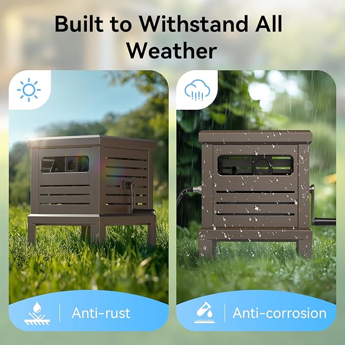 • Easy Winding & Tangle-Free Operation: This garden hose reel features a manual crank handle and hose guide system that prevents tangling and ensures smooth winding. The stable foot pedal keeps the hose reel box secure during use, perfect for organized and hassle-free storage