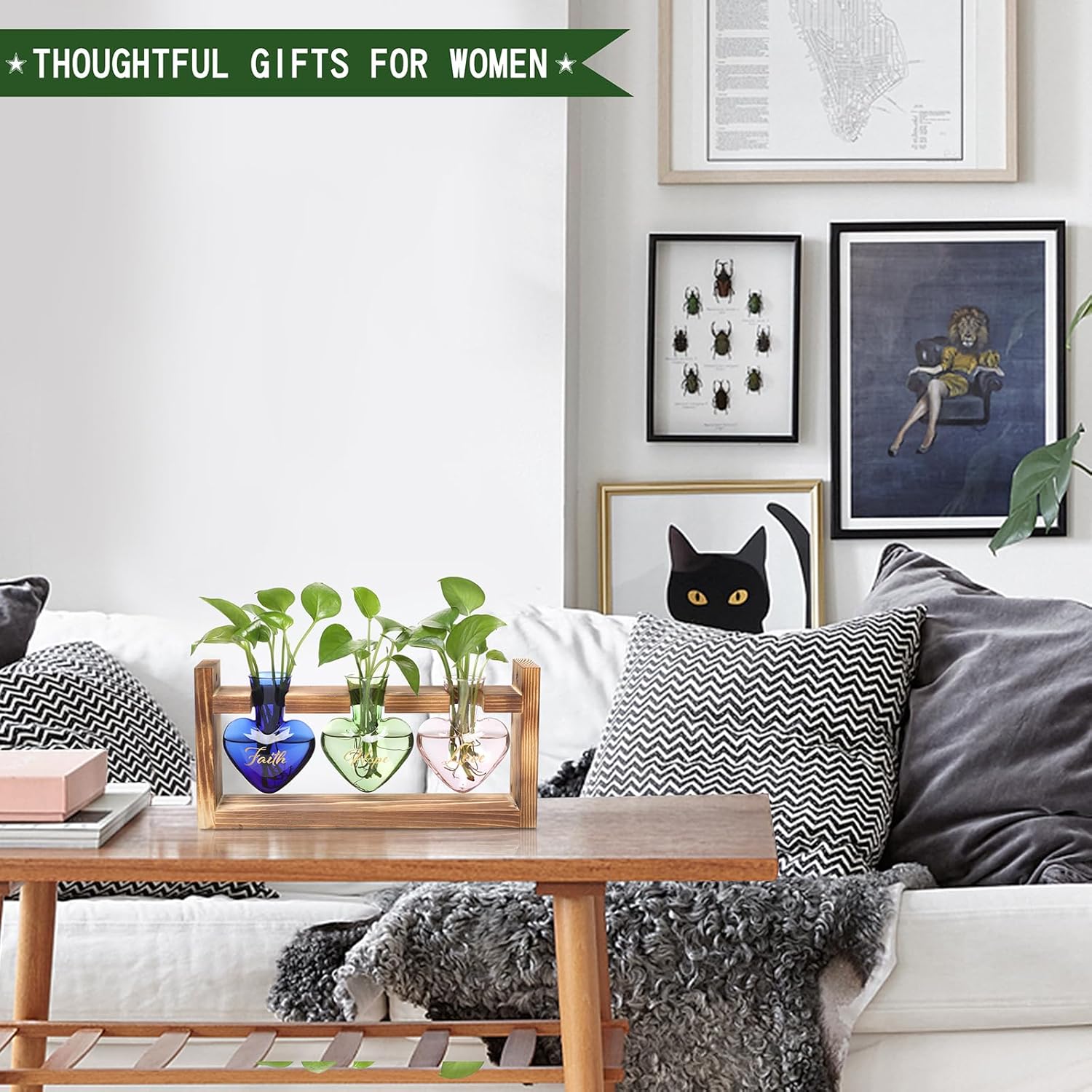 Plant Terrarium Propagation Stations Faith Hope Love Hydroponics Home Garden Decoration Gift for Women with Wooden Stand Heart Shaped Colored Glass Vase
