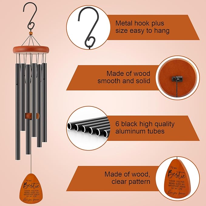 • Soothing Sounds for Relaxation: With its precise design and six thick-walled aluminum tubes, this wind chime produces soothing melodies, creating a serene atmosphere that promotes relaxation and tranquility. It's a perfect way to express your love and strengthen your bond with your friend, bestie.