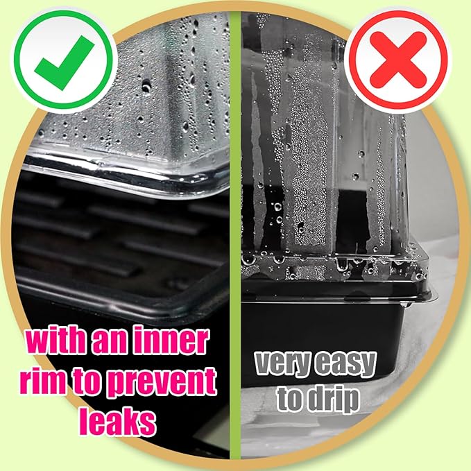 • 【4'' Drip-proof Dome】Say goodbye to messy condensation! Our dome is expertly designed to channel water back into the seed tray, so you’ll never have to deal with leaks or spills. The tall, transparent dome provides ample space for seedlings to thrive for weeks, while the adjustable air vents allow you to control airflow effortlessly. Plus, the clear design ensures maximum light penetration and a clear view of your growing plants.