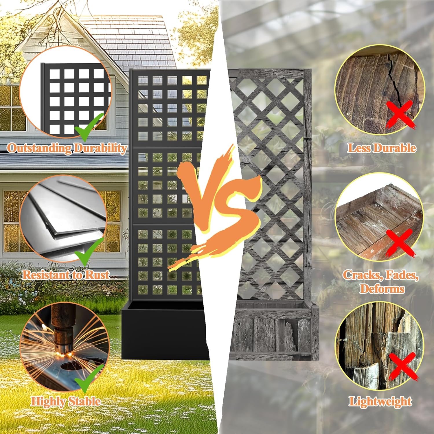• Space-Efficient Design: Combining a planter box with a trellis, this product offers a space-saving solution ideal for gardening in limited spaces, allowing you to create a beautiful vertical garden even in small areas.