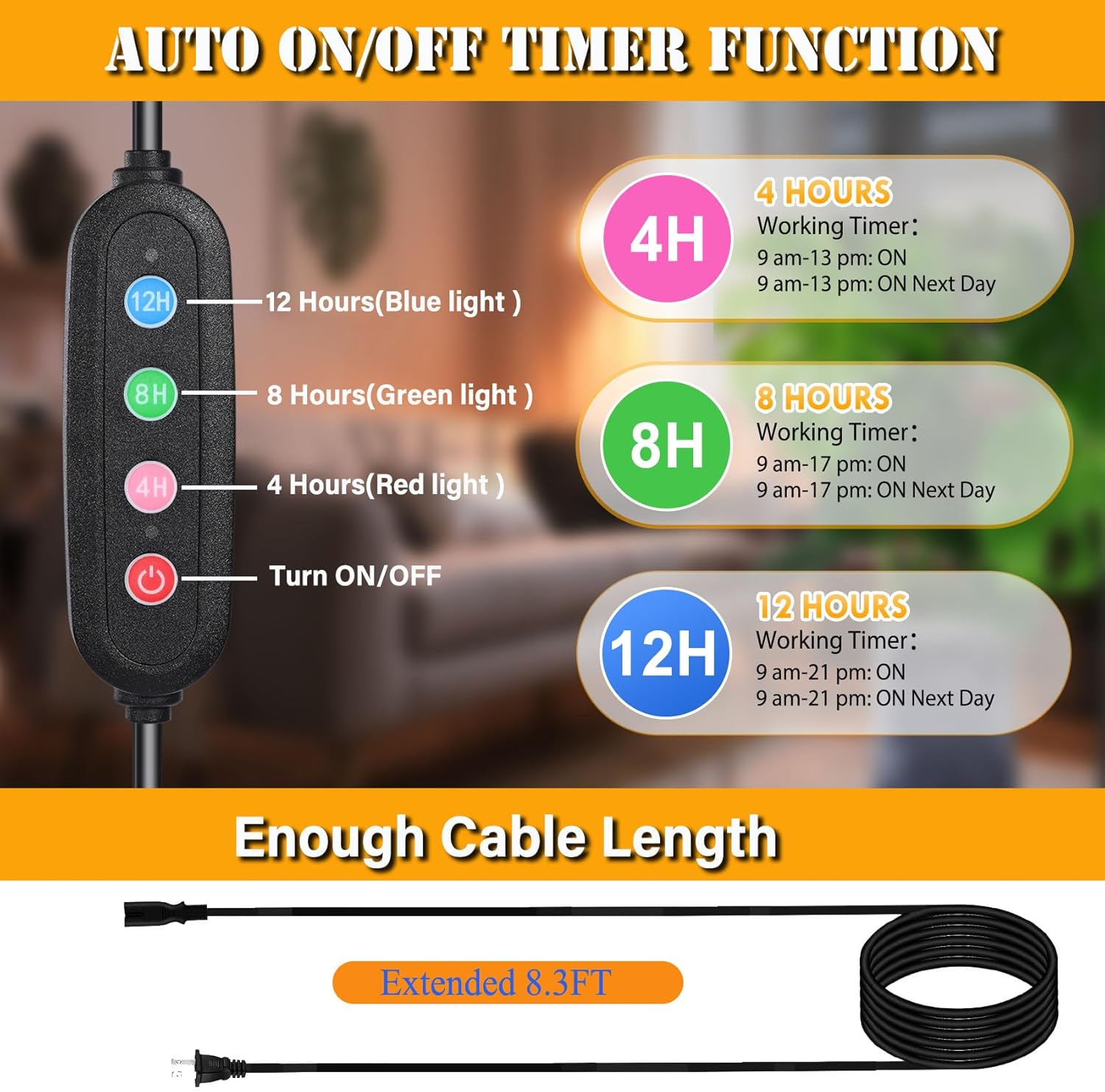 - AUTO TIMER FUNCTION AND 8.3 FT LONG POWER CORD:The timer is fit on the cord, there are three different times to choose from 4/8/12 hours, led grow light is color coded; as soon as you set the time, it will automatically turn on/off again every day (Freeing your hands is perfect.). Enough cable length for you place the grow lamp about 8.3 feet from the outlet with plenty of extra.