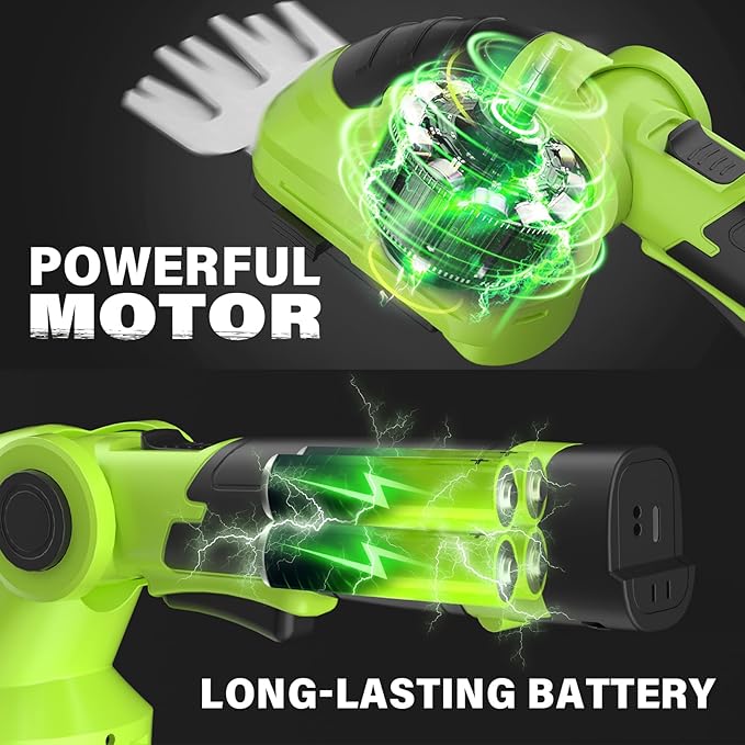 • **Powerful Motor**: Equipped with a strong electric motor, this cordless hedge trimmer delivers reliable performance, making it ideal for tackling thick grass and dense shrubbery with ease.