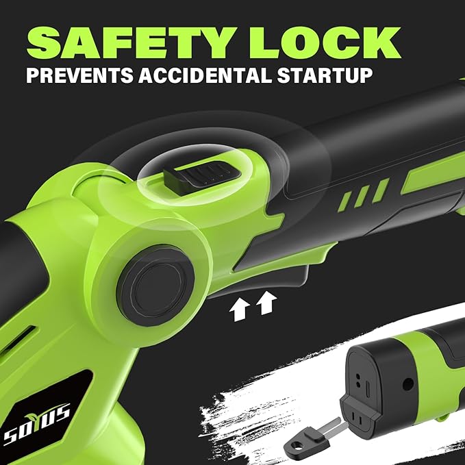 • **Safety First**: Designed with triple safety protection, the SOYUS grass trimmer requires the insertion of a safety key and simultaneous pressing of two buttons to ensure safe operation, prioritizing user safety during use.