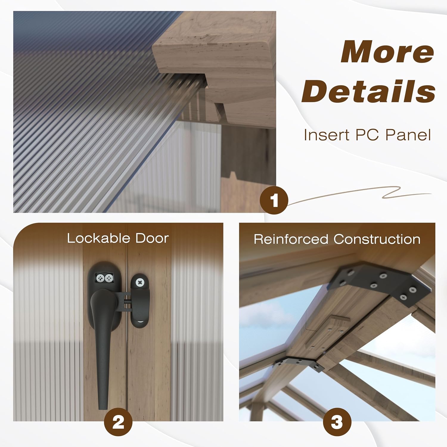 • Lockable Door & Walk-in Space: This walk-in greenhouse has a front door that you can easily enter and lock when you leave without worrying about losing items. Add some furniture to turn your wooden greenhouse into a vibrant party room.