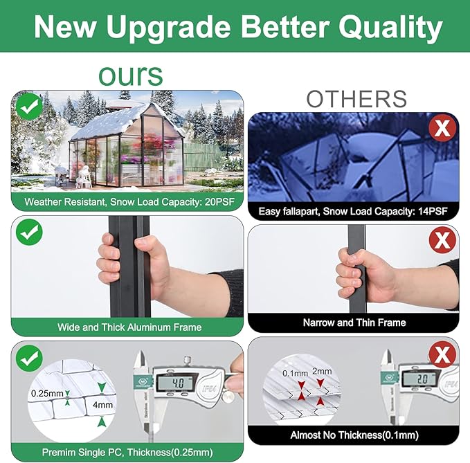 • Sturdy Frame: Our greenhouse kit boasts a robust rust-resistant aluminum frame designed to withstand various weather conditions. Introducing patented technology, Easy assembly, saving you 50% of your time. Gone are the days of tedious setups. With a simple push and locking screw, our Quick Connect ensures a reliable, secure, and swift link-up. It can also support snow loads of up to 20PSF.