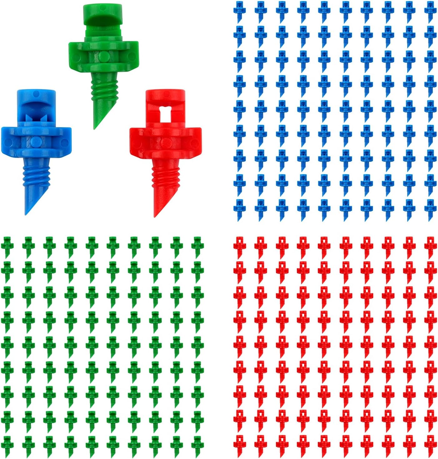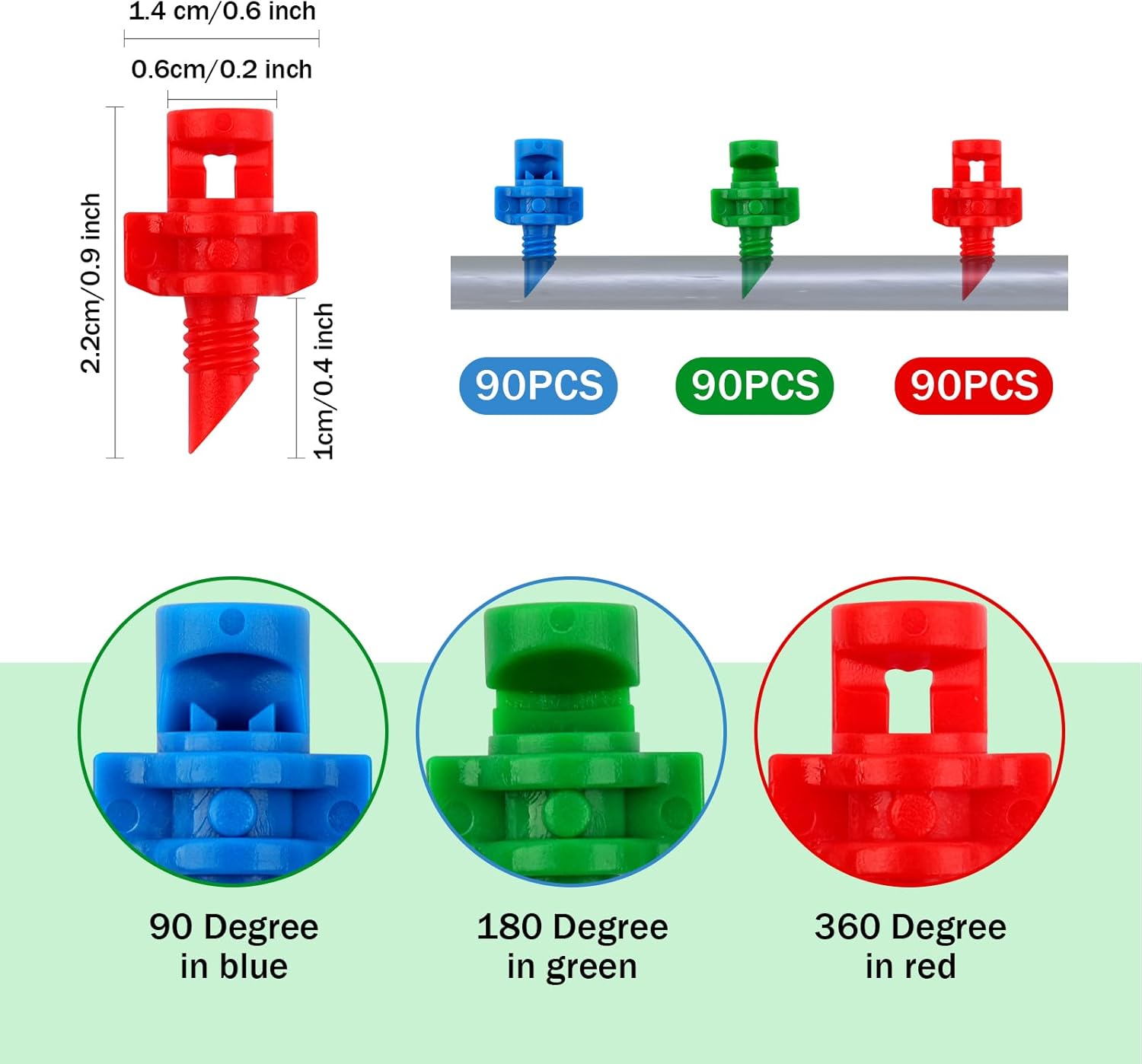 • 【Package Included】You will receive 270pcs misting nozzles with different refraction angles, including 90pieces 90 degree blue nozzles, 90pieces 180 degree green nozzles and 90pieces 360 degree red nozzles. Enough quantity of atomizing sprinklers ensures you have an ample supply for your gardening needs in the misting system.