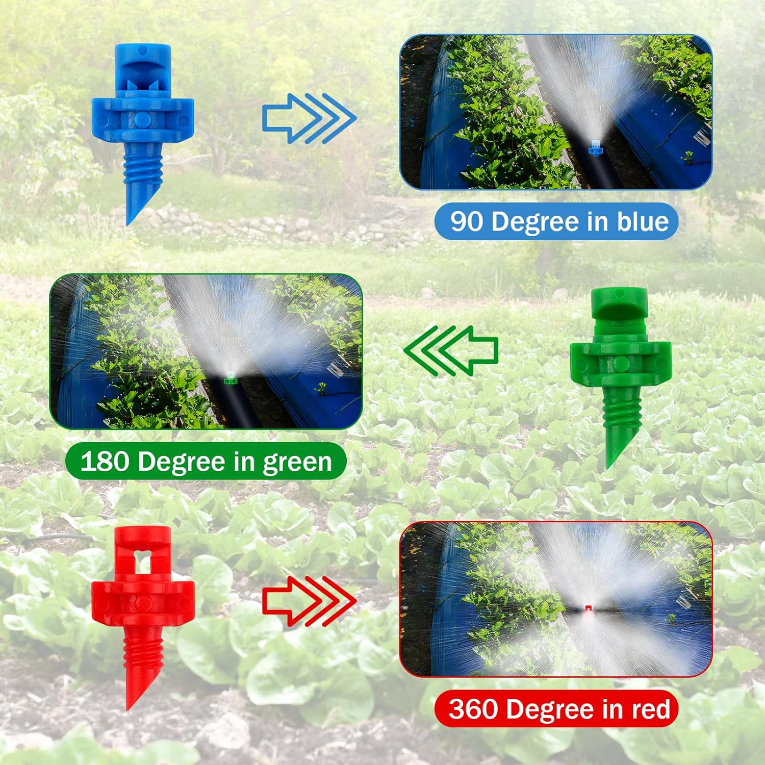 • 【Three Angles of Refractive Spray】The micro irrigation sprayer contain three misting nozzles with different refraction angles, includes 90°, 180°, and 360°. Sprinklers can spray water in all directions without manual intervention. Our drip irrigation parts can effectively prevent water backflow, perfect for setting up an irrigation system for your garden.