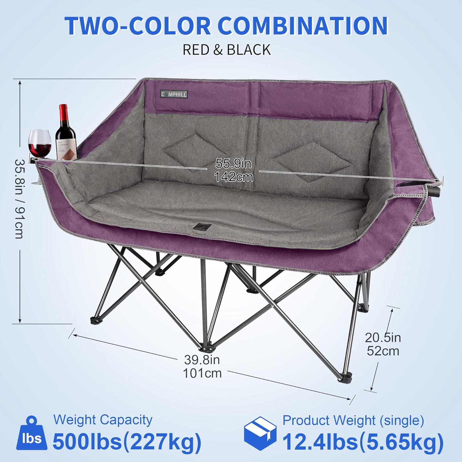 Oversized Double Camping Chair-Heavy Duty 2 Person Folding Loveseat Camp Couch for Adults,Portable Outdoor Lawn Chairs with Padded Seat for Fishing,Sports and Patio,Supports 500 LBS,Purple