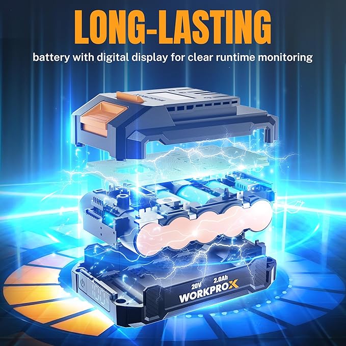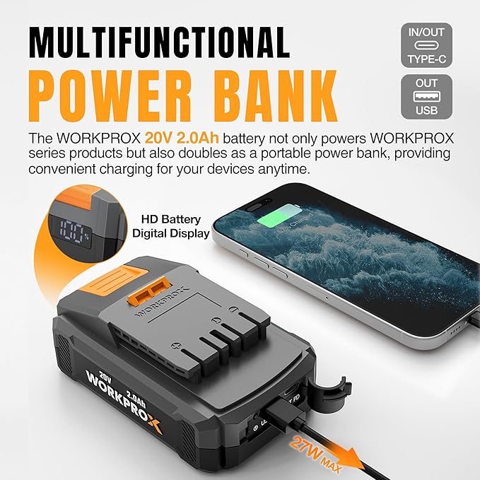 • Powerful Performance: The 2.0Ah battery delivers impressive power to the WORKPROX 20V cordless hedge trimmer, providing up to 40 minutes of grass cutting or 45 minutes of hedge trimming on a single charge. This battery also powers various WORKPROX 20V power tools and can double as a portable power bank. Check battery level at a glance with the integrated display. (Tip: We recommend using a 30W charger for an ultra-fast 1.5-hour recharge. Note: A charging adapter is not included.)