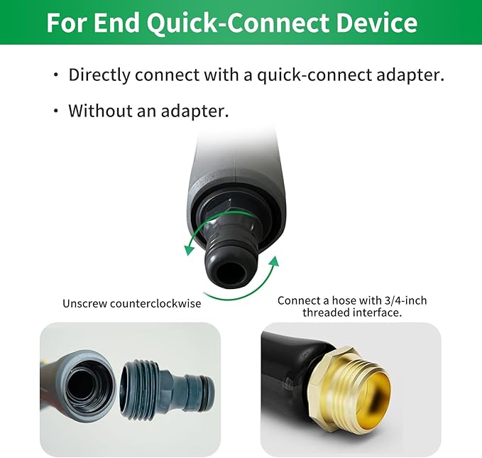 • Enjoy precise control with the 180° adjustable ratcheting head. This feature ensures you can angle the spray exactly where you need it, making watering easier.There is a quick-connect device at the rear end. If you don't need it, you can remove it by rotating it counterclockwise.