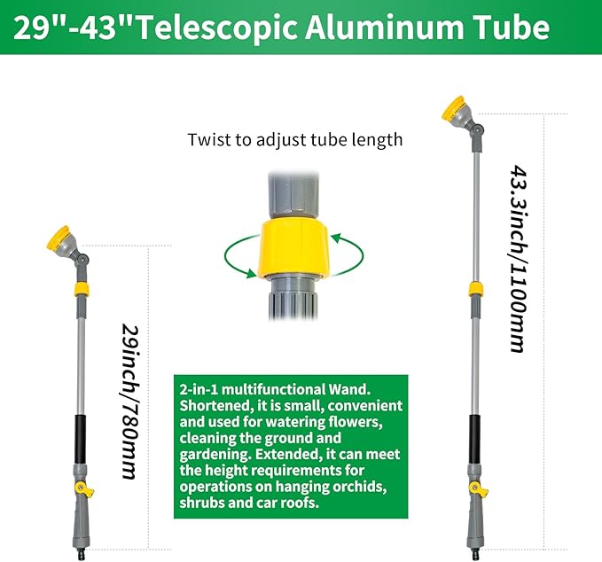 • Effortlessly water your hanging baskets and shrubs with the 29"-43" metal watering wand. Its long telescopic tube extends to reach even the highest spots.It adopts a sturdy and durable aluminum metal tube body and an exquisite gray painting process.