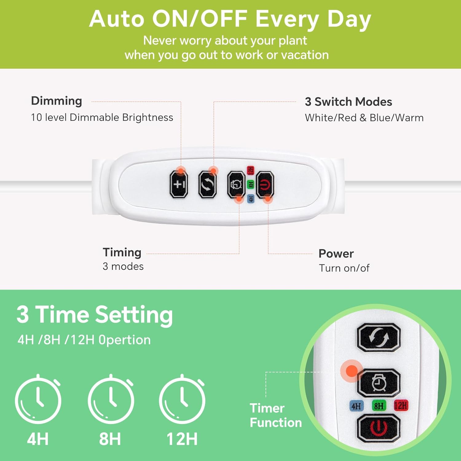 • Three-Stage Timer Switch: The desktop plant lamp includes 4-hour/8-hour/12-hour timer modes, allowing you to set lighting durations of 4, 8, or 12 hours. Choosing the 8-hour option ensures it operates for 8 hours daily, automatically turning off after 24 hours, ensuring plant care even when you're away.