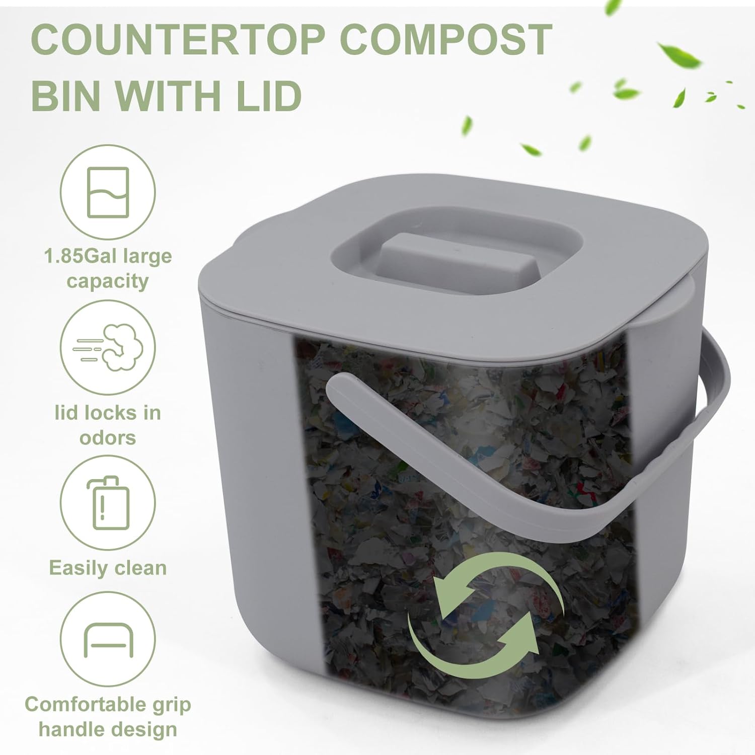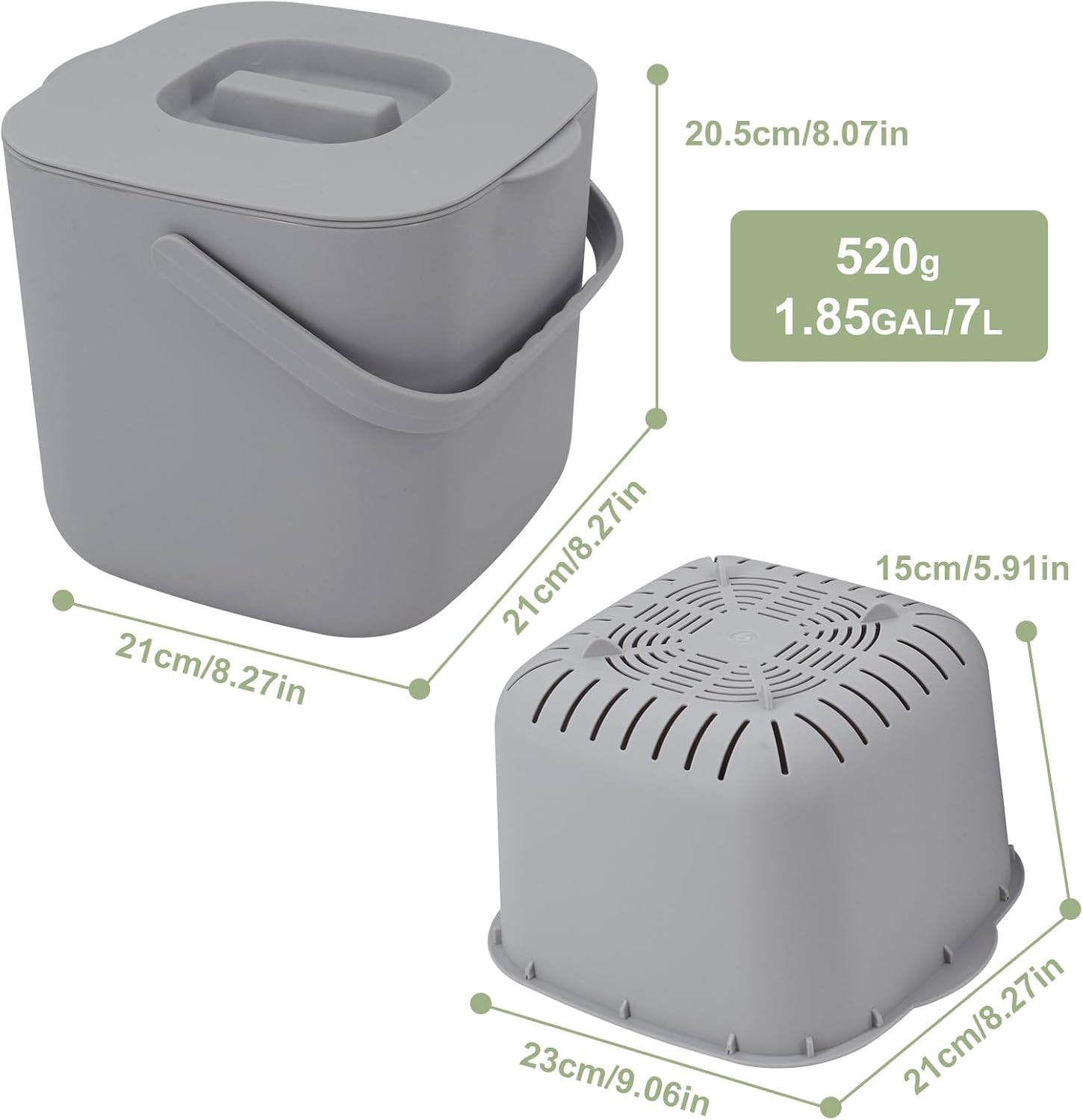 Stylish Kitchen Compost Bin- 1.85 Gal/ 7L Countertop Compost Bin with Lid, Inner Sieve for Separating Liquid from Food, Easy to Clean (Grey, 1.85GAL)