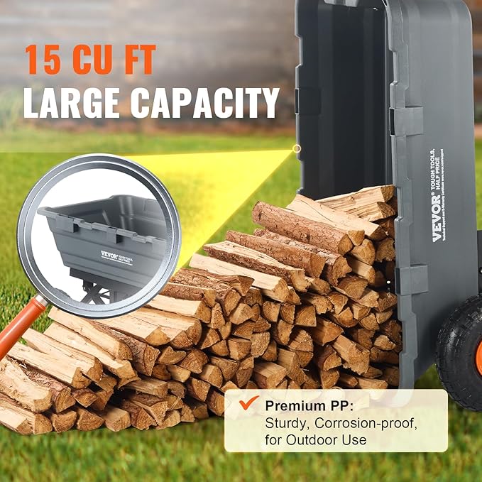 • 13in ALL TERRAIN WHEELS: With 13" large rubber tires, the yard cart provides excellent shock absorption, navigating uneven garden terrain or grassy slopes, ensuring smooth transport.