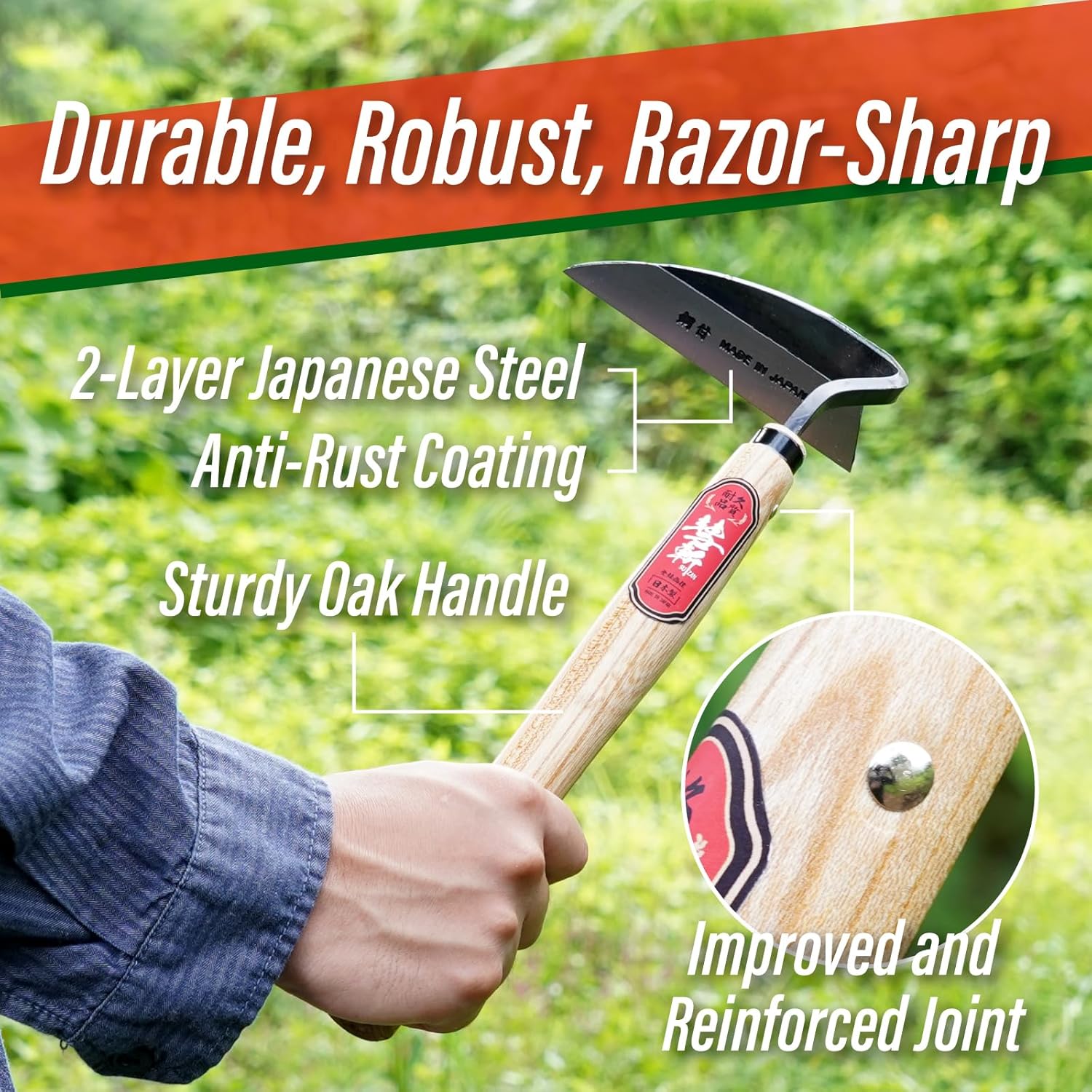 • 【Razor-Sharp Blade】Crafted like a Japanese sword, the high-quality two-layer Japanese carbon steel blade is expertly honed by artisans for outstanding sharpness and durability. It enables swift, precise cuts, removing weeds cleanly from the root with lasting sharpness.