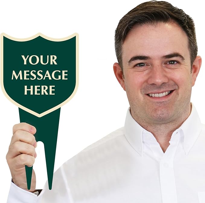SmartSign Custom Designer Yard Stake Sign - Add Your Message, 6"x12", Vintage Shield Shape, 120 mil Aluminum Composite Sign w/Overcoat for Outside, Integrated Ground Stakes, Reflective Option, USA-Made