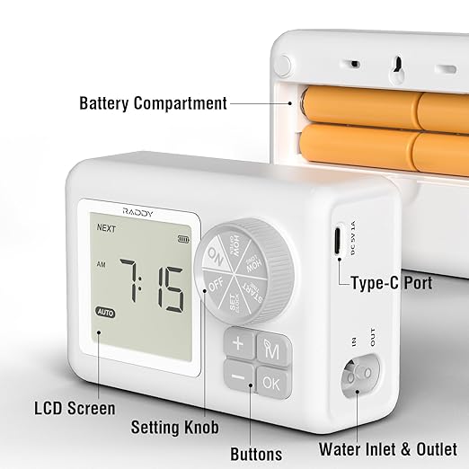 • Easy Installation: The Raddy WS-6 simplifies setup with a complete kit, including an auto water timer, 33-foot 1/4" tubing, check valve, Type-C cable, micro drippers, and various connectors. Simply connect the components, set it up, and let it water your plants automatically