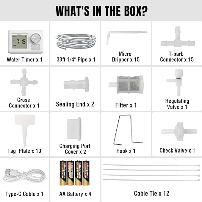• Easy DIY Installation: Get started quickly with a complete kit that includes a smart water timer, 33 ft of 1/4" tubing, tag plate, check valve, regulating valve, Type-C charging cable, micro drippers, and a variety of connectors. Just connect the components, set your schedule, and let the system take care of your plants automatically
