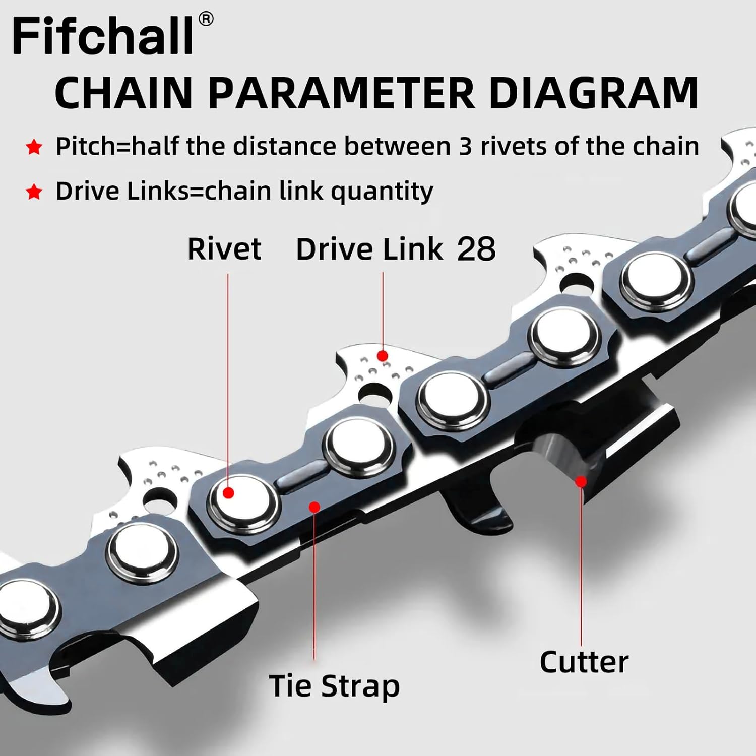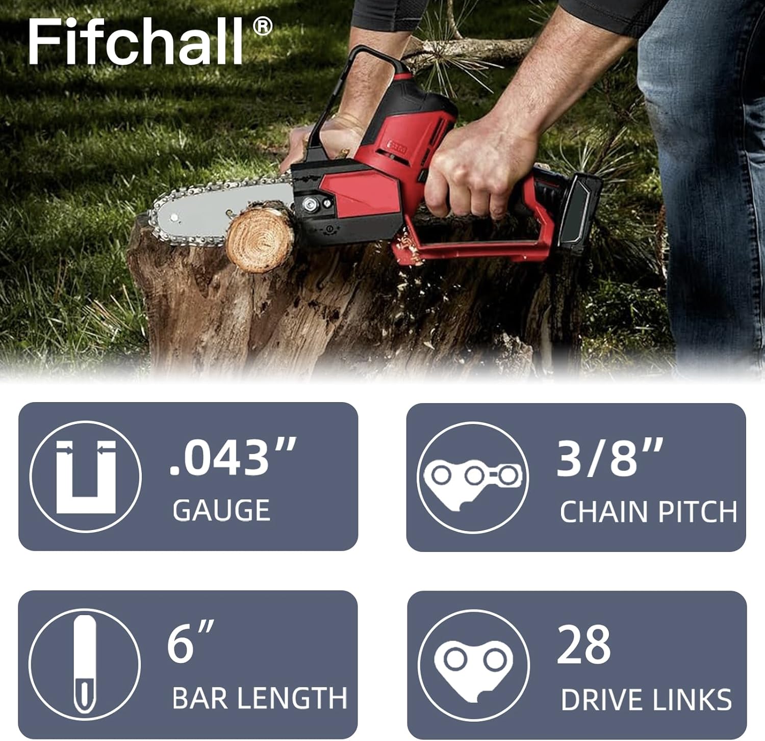 • FIFCHALL Service: If you have any questions about this 6 inch chainsaw chain, please feel free to contact us email us. Please note these are 6" 3/8" LP Pitch .043" Gauge 28 Drive Links Chainsaw Chains, please check these data!(Tips: Visit the FIFCHALL amazon store for all sizes of saw chains.)