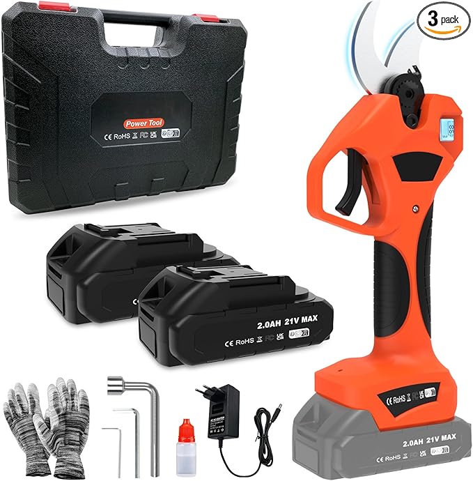 • 【EFFICIENTCUTTING & LCD DISPLAY】 Electric garden pruning scissors is forged from Swiss SK5 high carbon steel which is sharp and anti-rustand powered by brushless motor. Tree branch trimmer has strong power, it can easy cut branches over 1.6 inch (40mm) quickly without damage. Our electric tree trimmer are equipped with an LCD display that shows the number of cutting processes and remaining power.