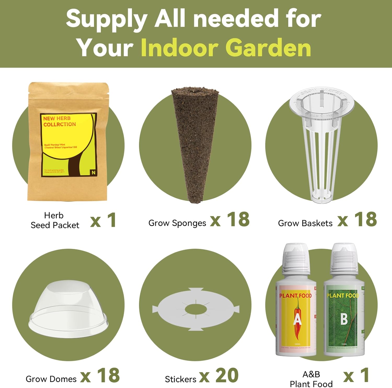 • Comes With Everything: This seed pod kit contains everything you need for your herb garden: 7 non-GMO seeds (Basil(Ocimum basilicum), Cilantro(Coriandrum sativum), Dill(Anethum graveolens), Parsley(Petroselinum crispum), Mint(Mentha spp.), Shiso(Perilla frutescens), Liquorice(Glycyrrhiza glabra)), 18 grow sponges, 18 grow domes,18 grow baskets,18 stickers, and A&B plant food