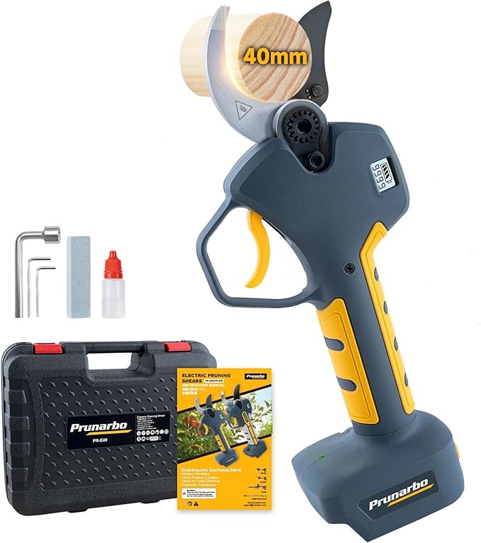 • 【Built in Safety Switch】Safety is a key feature of the Prunarbo's electric pruners cordless. With a built-in safety lock, you need to press the switch twice quickly before use to prevent accidents. The power pruner will enters “standby” mode and stop working if 60 seconds without cutting. And it will enter "auto turn off" mode after 15mins when not in sue. Then you need to restart it if you want to prune again.