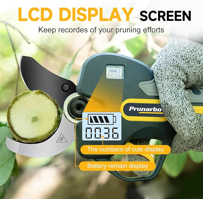 - 【Secure Operation with Safety Feature】Safety is a key feature of Prunarbo's cordless pole pruner. With a built-in safety lock, you need to press the switch twice quickly before use to prevent accidents. The machine will enters “standby” mode and stop working if 60 seconds without cutting. And it will enter "auto turn off" mode after 15mins when not in use. Then you need to restart electric pole pruner if you want to work again.