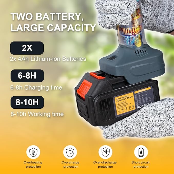 - 【8000mAh Battery & Compatible with Makita】Our battery pruning shears with extension pole are equipped with 2 * 4000mAh batteries. Two batteries can support you 8-10 hours of trimming work! The superior battery capacity compared to the other product in the market is higher. Also, Our cordless pruner with pole is compatible with Makita battery. It provides convenience and better experience for people who owns Makita 18V battery.