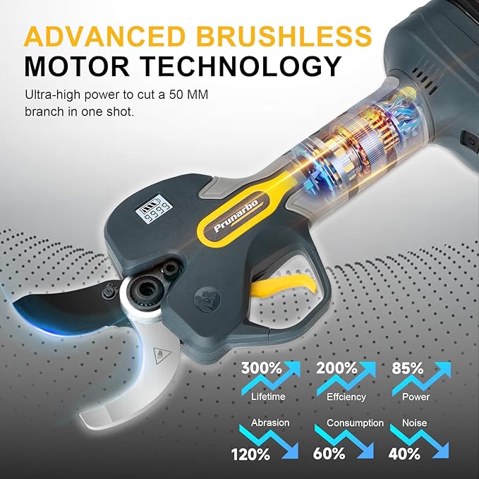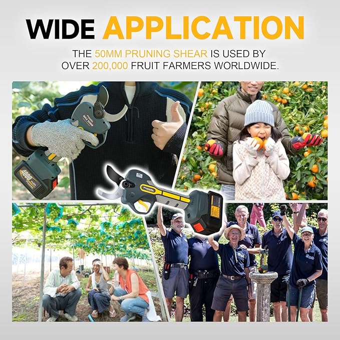- 【Cuts 5CM Thick Branches Like Magic】The cordless pruners with extension can effortlessly tackle branches of 50mm diameters in just one cut. With Japanese SK5 high carbon steel blade with teflon coating and max 900W brushless motor, the tree pole pruner deliver fast and ensure a clean-cut for healthier plants. It is specifically designed for professional orchardists to effortless prune oak, maple, cedar and fruit trees like citrus, apple, peach, grape.