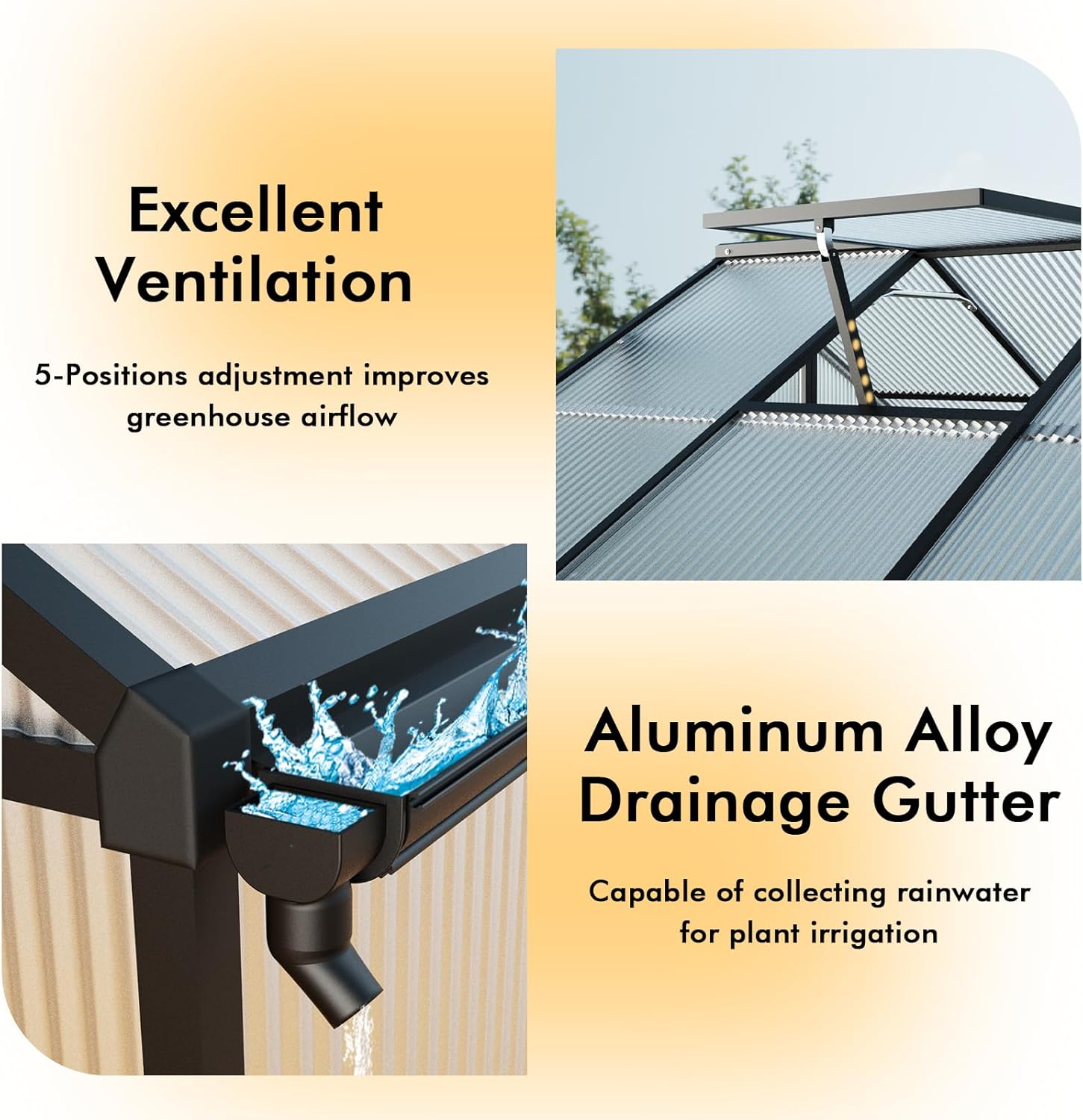 • QUALITY UV RESISTANT PANELS – The 720g PC panels of this polycarbonate greenhouse that are 4mm thick and twin-wall polycarbonate roof panels are designed for strength and clarity. These shatterproof panels let in just the right amount of light while controlling humidity and temperature in your greenhouse. They effectively block harmful UV rays, creating the great environment for your plants to thrive and preventing sunburn