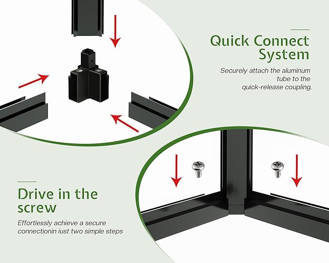 • Quick Connect System: This greenhouse kit can be assembled by three people in just 8 hours, thanks to the innovative Quick Connect technology. The easy-to-use push and locking screw system reduces setup time by 50%, ensuring a fast and secure connection