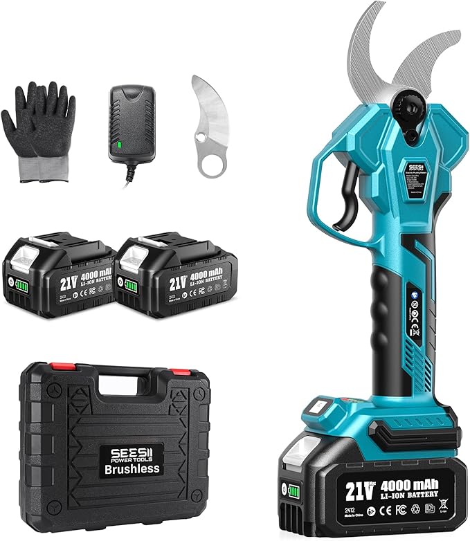 Seesii Electric Pruning Shears for Gardening: 1.8” Cutting Cordless Power Pruner - Brushless Motor, Dual 4.0Ah Battery, 4 Levels Adjustable Extra SK5 Blade Branches Cutter For Tree & Flower Trimming