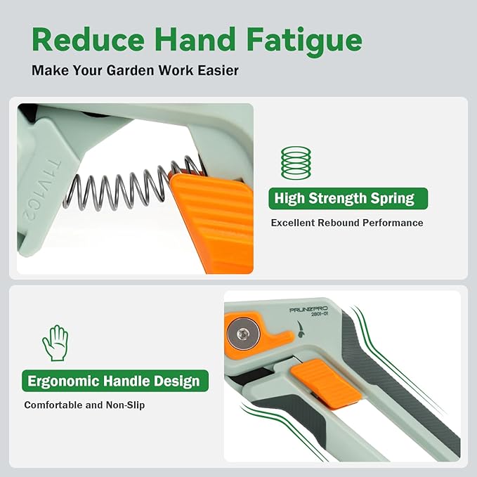 • 【Innovative Material】Compared to traditional carbon steel and SK2, we've upgraded to 1.4031 German stainless steel, which boasts higher hardness and toughness, and its rust resistance is significantly superior to that of traditional materials. This upgrade makes our pruning shears more durable and offers a longer lifespan
