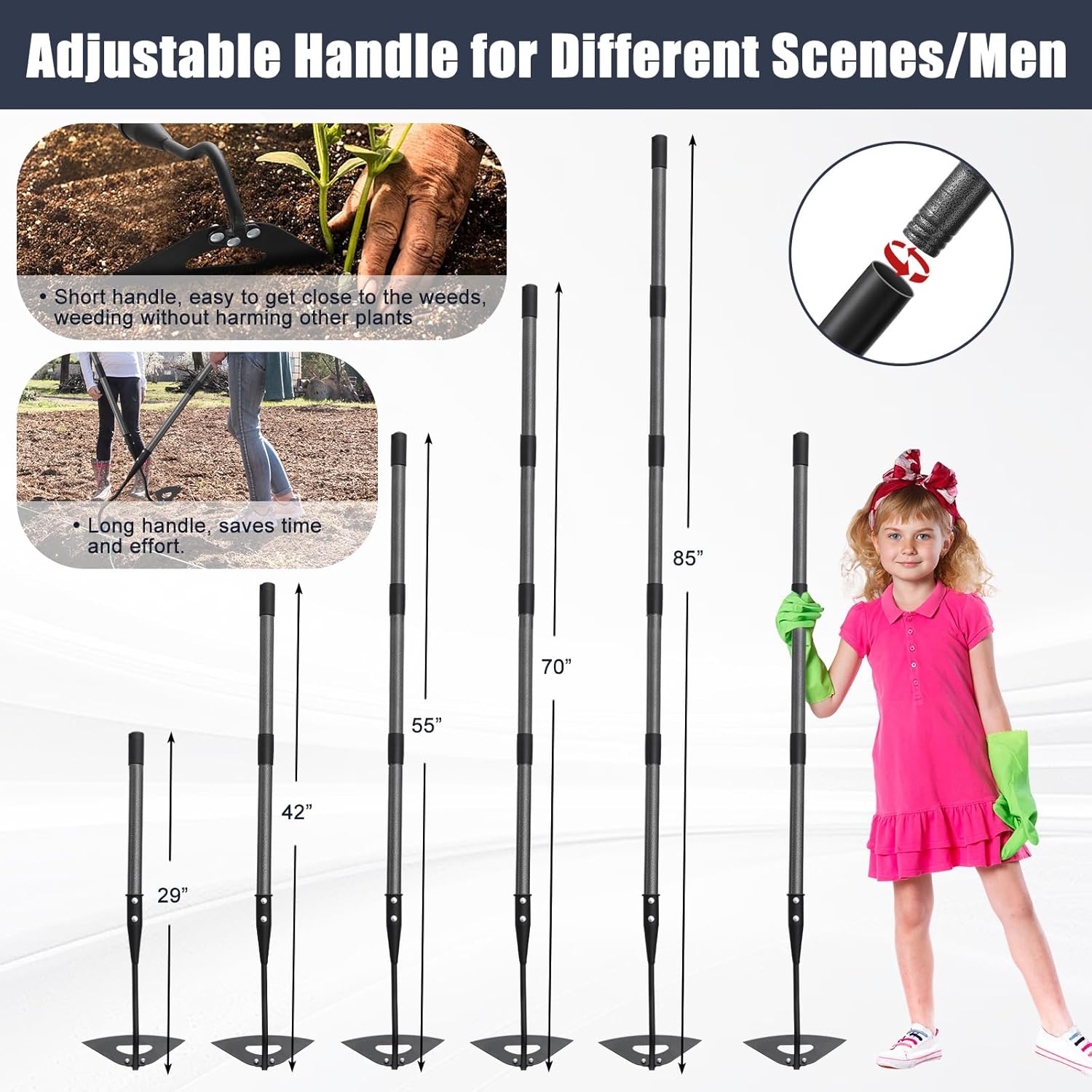 • LONG HANDLE GARDENING HOE: Adjustable length is designed to fit people of different heights, and you can also adjust the length according to different usage scenarios. The long handle mode can complete gardening work efficiently and make gardening easier, you don't have to bend down anymore; the short handle mode can get closer to the plants more conveniently, it can easily remove the weeds around the flowers without touching any flowers.