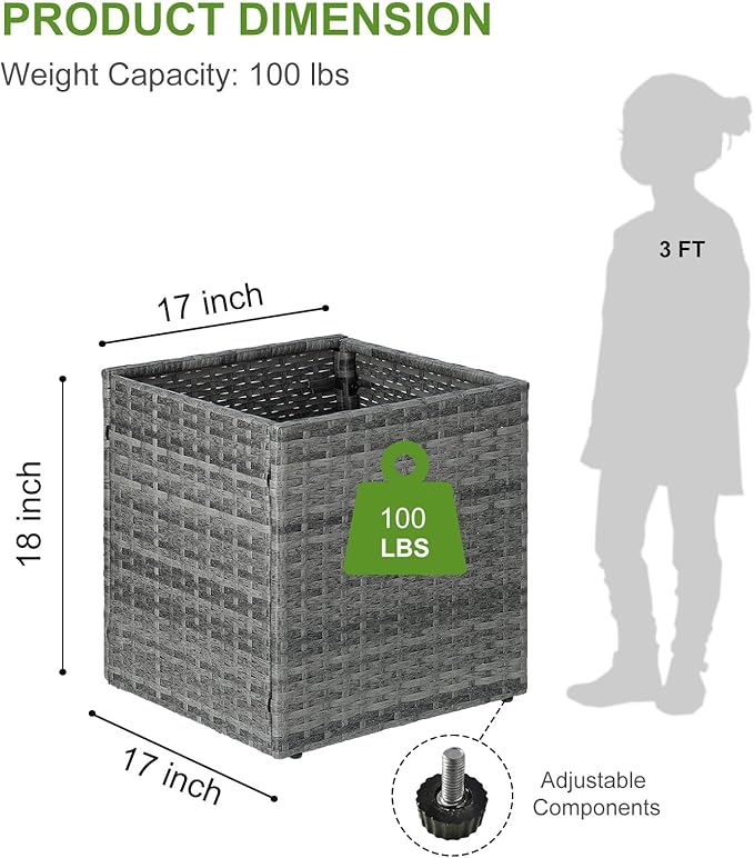 • Removable Liner: Each wicker planter in this set comes with a nonwoven fabric liner (measures 16 x 16 x 17 inch) that separates wicker from the soil. Keep planter in excellent condition to prevent weeds and other invasive species from interfering with plant growth